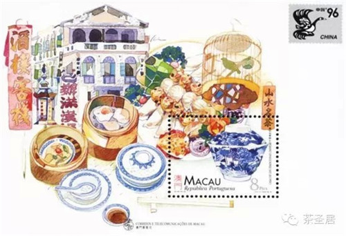 1996年,澳门发行了一套以“中传统茶楼”为题材的邮票,共四枚,四连印的格式,描绘了一件茶楼大厅“赏鸟”“戏童”“卖报”“品茗”的景象,展现了昔日澳门的茶楼风光。
