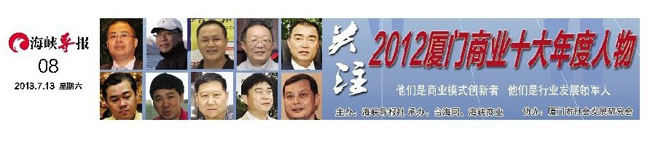 这两年来,许多企业家感叹市场竞争越来越残酷,有些扛不住的,或者倒下了,或者“跑路”了……但也有许多勇敢迎战,逆势崛起的。这些逆势崛起者,理应收获掌声和喝彩。因而,海峡导报社、台海网、海峡商业杂志社联手厦门市社会发展研究会共同举办“2012厦门商业十大年度人物”评选活动,目的就是通过主流媒体与权威机构的力量,寻找厦门逆势崛起的商业创新人物,他们所掌控的企业,可能是厦门地区的行业龙头,也可能是行业里正在高速成长的中小企业,通过对他们的关注和报道,洞悉明天的市场机会和产业地图。这也是海峡导报社身为主流媒体不可推卸的使命。
