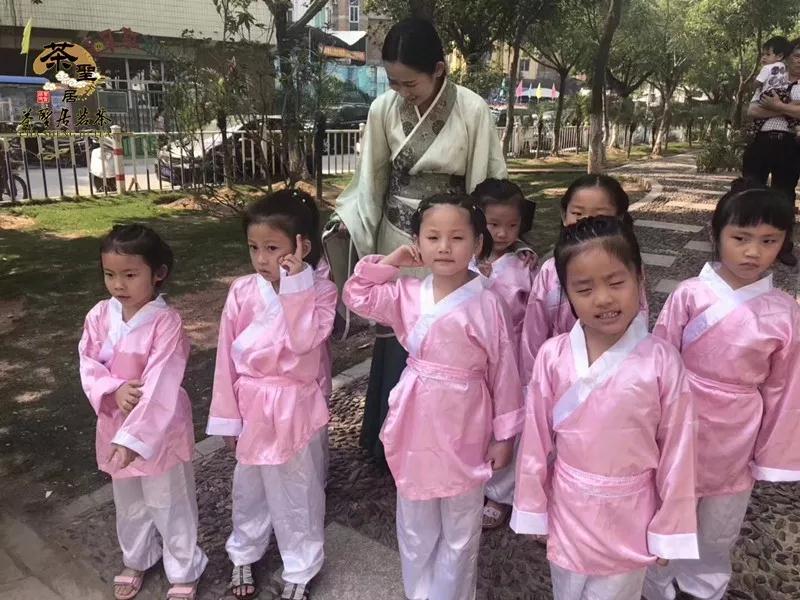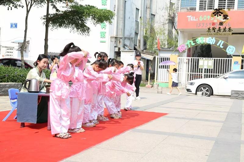 (图:茶圣学院少儿班的学员们向妈妈作揖、鞠躬、奉茶)