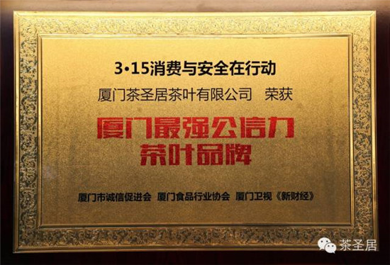 今年茶圣居更是获得了由厦门卫视《新财经》联手厦门市诚信促进会、厦门食品行业协会共同推出的“3.15消费与安全在行动诚信商家”评比,经过6个月的专家严格评审及层层筛选而出的 最具公信力企业奖。
