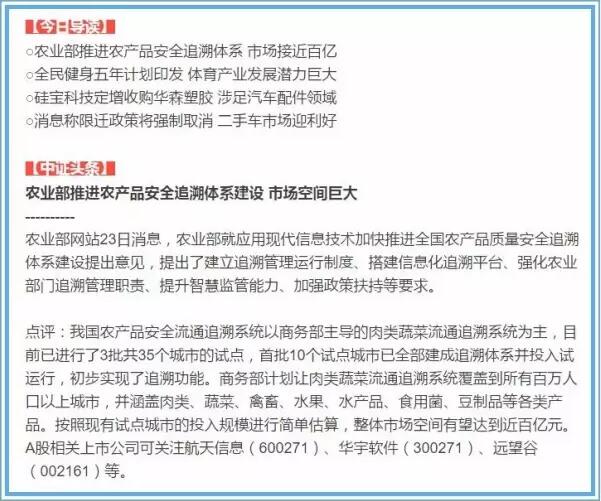 意见指出,目标建立全国统一的追溯管理信息平台、制度规范和技术标准,国家平台将于2017年上线,优先选择苹果、茶叶、猪肉、生鲜乳等几类农产品统一开展追溯试点,逐步扩大追溯范围。