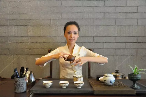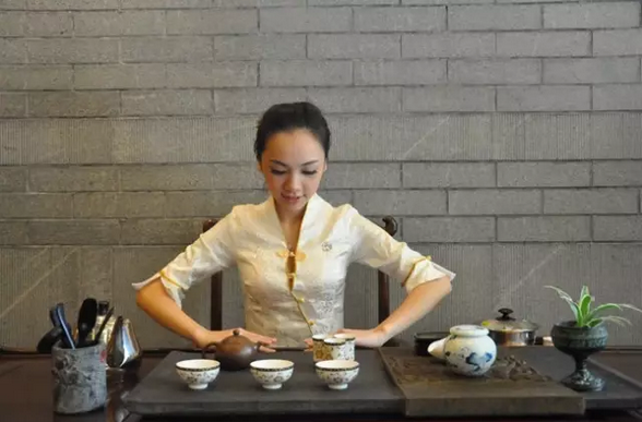 茶艺师把泡好的绿茶敬奉给客人,意在祝福好人们一生平安。