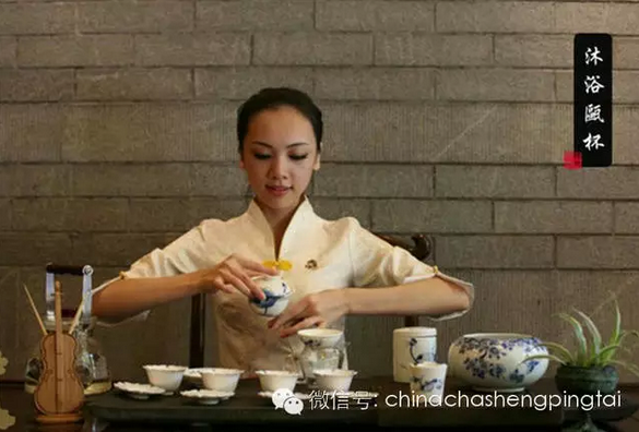 沐浴甌杯”就是用开水再烫一遍本来就干净的杯子,使品茗杯冰清玉洁。